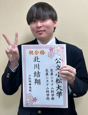 私はメンタルがかなり弱く、何度も受験をあきらめそうになりました。それでも、得意だった物理と数学を中心に頑張って、自分を信じ、何とか公立小松大学に受かりました。後輩の皆さんは、大変な受験期だからこそ、自分を信じることを大切にしてください。