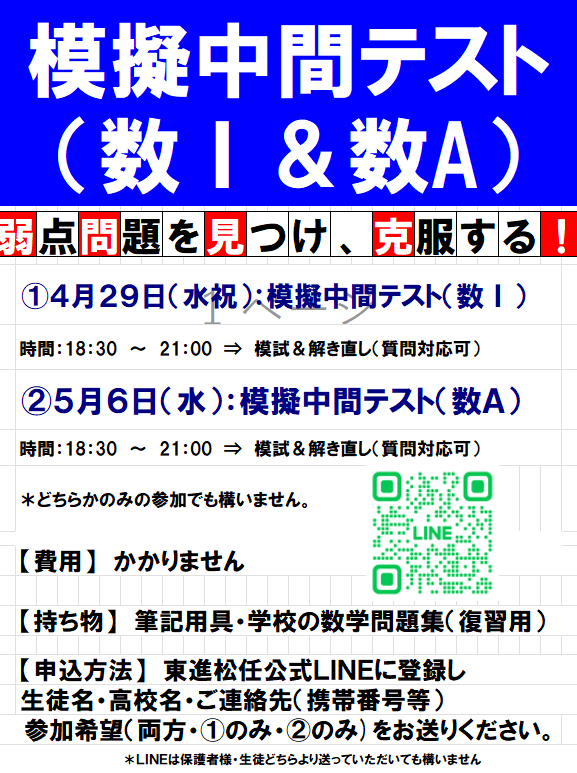 【高1】GWセミナー(模擬中間テスト数Ⅰ・A) 公開済み: 2026年4月21日更新: 2026年4月21日作成者: 村田充 GW明けの高校で初の中間テストは、数学の成否が大きな鍵をにぎります。そこで、模擬中間テストを行います。参加されたい場合は、案内の公式ラインか、下記フォームにてメッセージの欄に高校名、連絡先(携帯番号等)をご記入の上、お申込ください。 名前(必須) メール(必須) サイト メッセージ 送信 村田充東進松任駅前校 校長 高1・2・3/ 東進中学NET 学年主任・担任